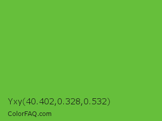 Yxy 40.402,0.328,0.532 Color is a normal green color and the nearest color is Green RYB #66b032. Hex code #66bf3b and RGB value is rgb(102,191,59). In RGB color space, this color is composed of 40% red, 75% green, 23% blue, In CMYK color space, this color is composed of 47% cyan, 0% magenta, 69% yellow , 25% black , In HSL color space, this color has a hue angle of 100° , 53% saturation and 49% lightness.