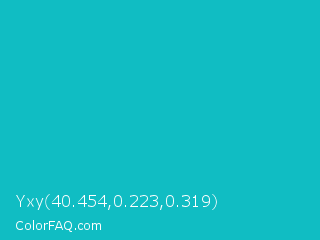 Yxy 40.454,0.223,0.319 Color is a normal cyan color and the nearest color is Tiffany Blue #0abab5. Hex code #10bdc3 and RGB value is rgb(16,189,195). In RGB color space, this color is composed of 6% red, 74% green, 76% blue, In CMYK color space, this color is composed of 92% cyan, 3% magenta, 0% yellow , 24% black , In HSL color space, this color has a hue angle of 182° , 85% saturation and 41% lightness.