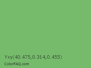 Yxy 40.475,0.314,0.455 Color is a normal green color and the nearest color is Mantis #74c365. Hex code #76bb6c and RGB value is rgb(118,187,108). In RGB color space, this color is composed of 46% red, 73% green, 42% blue, In CMYK color space, this color is composed of 37% cyan, 0% magenta, 42% yellow , 27% black , In HSL color space, this color has a hue angle of 112° , 37% saturation and 58% lightness.