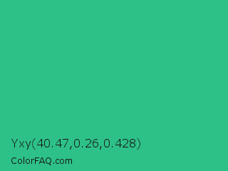 Yxy 40.47,0.26,0.428 Color is a normal green color and the nearest color is Mountain Meadow #30ba8f. Hex code #2ec187 and RGB value is rgb(46,193,135). In RGB color space, this color is composed of 18% red, 76% green, 53% blue, In CMYK color space, this color is composed of 76% cyan, 0% magenta, 30% yellow , 24% black , In HSL color space, this color has a hue angle of 156° , 62% saturation and 47% lightness.