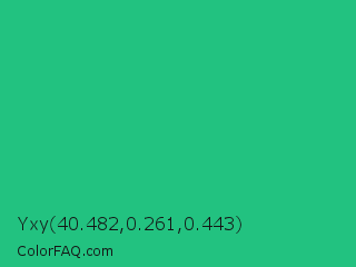 Yxy 40.482,0.261,0.443 Color is a normal green color and the nearest color is Mountain Meadow Crayola #1ab385. Hex code #22c280 and RGB value is rgb(34,194,128). In RGB color space, this color is composed of 13% red, 76% green, 50% blue, In CMYK color space, this color is composed of 82% cyan, 0% magenta, 34% yellow , 24% black , In HSL color space, this color has a hue angle of 155° , 70% saturation and 45% lightness.