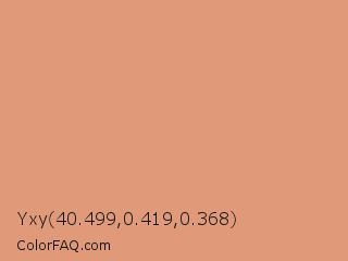Yxy 40.499,0.419,0.368 Color is a light orange color and the nearest color is Dark Salmon #e9967a. Hex code #e19a79 and RGB value is rgb(225,154,121). In RGB color space, this color is composed of 88% red, 60% green, 47% blue, In CMYK color space, this color is composed of 0% cyan, 32% magenta, 46% yellow , 12% black , In HSL color space, this color has a hue angle of 19° , 63% saturation and 68% lightness.