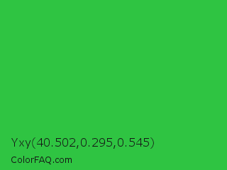 Yxy 40.502,0.295,0.545 Color is a normal green color and the nearest color is Lime Green #32cd32. Hex code #2fc442 and RGB value is rgb(47,196,66). In RGB color space, this color is composed of 18% red, 77% green, 26% blue, In CMYK color space, this color is composed of 76% cyan, 0% magenta, 66% yellow , 23% black , In HSL color space, this color has a hue angle of 128° , 61% saturation and 48% lightness.