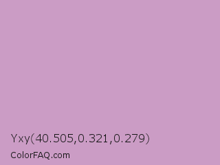 Yxy 40.505,0.321,0.279 Color is a light magenta color and the nearest color is Pastel Violet #cb99c9. Hex code #cb9cc5 and RGB value is rgb(203,156,197). In RGB color space, this color is composed of 80% red, 61% green, 77% blue, In CMYK color space, this color is composed of 0% cyan, 23% magenta, 3% yellow , 20% black , In HSL color space, this color has a hue angle of 308° , 31% saturation and 70% lightness.