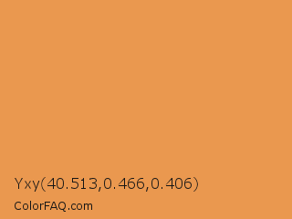 Yxy 40.513,0.466,0.406 Color is a light orange color and the nearest color is Big Foot Feet #e88e5a. Hex code #ea984f and RGB value is rgb(234,152,79). In RGB color space, this color is composed of 92% red, 60% green, 31% blue, In CMYK color space, this color is composed of 0% cyan, 35% magenta, 66% yellow , 8% black , In HSL color space, this color has a hue angle of 28° , 79% saturation and 61% lightness.
