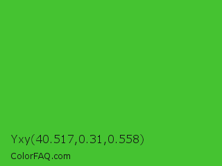 Yxy 40.517,0.31,0.558 Color is a normal green color and the nearest color is Lime Green #32cd32. Hex code #45c331 and RGB value is rgb(69,195,49). In RGB color space, this color is composed of 27% red, 76% green, 19% blue, In CMYK color space, this color is composed of 65% cyan, 0% magenta, 75% yellow , 24% black , In HSL color space, this color has a hue angle of 112° , 60% saturation and 48% lightness.
