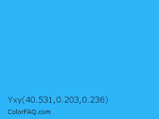 Yxy 40.531,0.203,0.236 Color is a normal blue color and the nearest color is Button Blue #24a0ed. Hex code #2db5fa and RGB value is rgb(45,181,250). In RGB color space, this color is composed of 18% red, 71% green, 98% blue, In CMYK color space, this color is composed of 82% cyan, 28% magenta, 0% yellow , 2% black , In HSL color space, this color has a hue angle of 200° , 95% saturation and 58% lightness.
