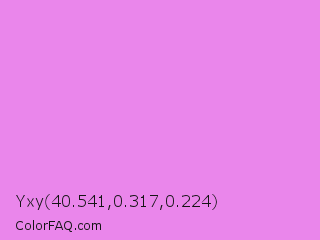 Yxy 40.541,0.317,0.224 Color is a light magenta color and the nearest color is Lavender Magenta #ee82ee. Hex code #ea86eb and RGB value is rgb(234,134,235). In RGB color space, this color is composed of 92% red, 53% green, 92% blue, In CMYK color space, this color is composed of 0% cyan, 43% magenta, 0% yellow , 8% black , In HSL color space, this color has a hue angle of 299° , 72% saturation and 72% lightness.