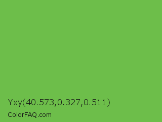 Yxy 40.573,0.327,0.511 Color is a normal green color and the nearest color is Bud Green #7bb661. Hex code #6dbe4a and RGB value is rgb(109,190,74). In RGB color space, this color is composed of 43% red, 75% green, 29% blue, In CMYK color space, this color is composed of 43% cyan, 0% magenta, 61% yellow , 25% black , In HSL color space, this color has a hue angle of 102° , 47% saturation and 52% lightness.