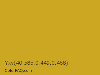 Yxy 40.585,0.449,0.468 Color is a normal yellow color and the nearest color is Lemon Curry #cca01d. Hex code #cca721 and RGB value is rgb(204,167,33). In RGB color space, this color is composed of 80% red, 65% green, 13% blue, In CMYK color space, this color is composed of 0% cyan, 18% magenta, 84% yellow , 20% black , In HSL color space, this color has a hue angle of 47° , 72% saturation and 46% lightness.