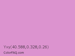Yxy 40.588,0.328,0.26 Color is a light magenta color and the nearest color is Light Orchid #e29cd2. Hex code #dc93cf and RGB value is rgb(220,147,207). In RGB color space, this color is composed of 86% red, 58% green, 81% blue, In CMYK color space, this color is composed of 0% cyan, 33% magenta, 6% yellow , 14% black , In HSL color space, this color has a hue angle of 311° , 51% saturation and 72% lightness.