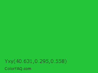 Yxy 40.631,0.295,0.558 Color is a normal green color and the nearest color is Lime Green #32cd32. Hex code #25c53a and RGB value is rgb(37,197,58). In RGB color space, this color is composed of 15% red, 77% green, 23% blue, In CMYK color space, this color is composed of 81% cyan, 0% magenta, 71% yellow , 23% black , In HSL color space, this color has a hue angle of 128° , 68% saturation and 46% lightness.