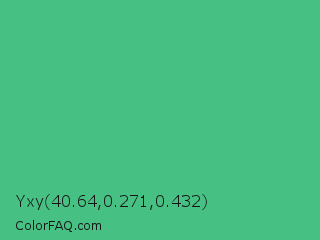 Yxy 40.64,0.271,0.432 Color is a normal green color and the nearest color is Ocean Green #48bf91. Hex code #47c083 and RGB value is rgb(71,192,131). In RGB color space, this color is composed of 28% red, 75% green, 51% blue, In CMYK color space, this color is composed of 63% cyan, 0% magenta, 32% yellow , 25% black , In HSL color space, this color has a hue angle of 150° , 49% saturation and 52% lightness.