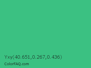 Yxy 40.651,0.267,0.436 Color is a normal green color and the nearest color is Mint #3eb489. Hex code #3bc182 and RGB value is rgb(59,193,130). In RGB color space, this color is composed of 23% red, 76% green, 51% blue, In CMYK color space, this color is composed of 69% cyan, 0% magenta, 33% yellow , 24% black , In HSL color space, this color has a hue angle of 152° , 53% saturation and 49% lightness.