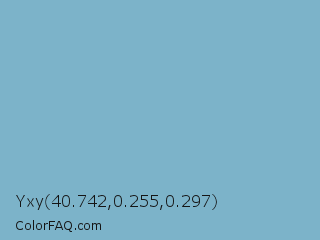 Yxy 40.742,0.255,0.297 Color is a light blue color and the nearest color is Glacier #80b3c4. Hex code #7cb3c9 and RGB value is rgb(124,179,201). In RGB color space, this color is composed of 49% red, 70% green, 79% blue, In CMYK color space, this color is composed of 38% cyan, 11% magenta, 0% yellow , 21% black , In HSL color space, this color has a hue angle of 197° , 42% saturation and 64% lightness.