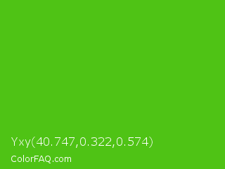 Yxy 40.747,0.322,0.574 Color is a normal green color and the nearest color is Kelly Green #4cbb17. Hex code #4fc315 and RGB value is rgb(79,195,21). In RGB color space, this color is composed of 31% red, 76% green, 8% blue, In CMYK color space, this color is composed of 59% cyan, 0% magenta, 89% yellow , 24% black , In HSL color space, this color has a hue angle of 100° , 81% saturation and 42% lightness.