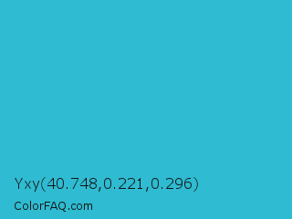 Yxy 40.748,0.221,0.296 Color is a normal cyan color and the nearest color is Scooter #2ebfd4. Hex code #2fbbd1 and RGB value is rgb(47,187,209). In RGB color space, this color is composed of 18% red, 73% green, 82% blue, In CMYK color space, this color is composed of 78% cyan, 11% magenta, 0% yellow , 18% black , In HSL color space, this color has a hue angle of 188° , 64% saturation and 50% lightness.