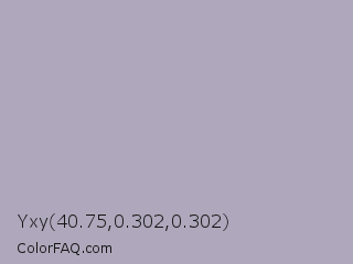 Yxy 40.75,0.302,0.302 Color is a light violet color and the nearest color is Spun Pearl #aaabb7. Hex code #afa8bc and RGB value is rgb(175,168,188). In RGB color space, this color is composed of 69% red, 66% green, 74% blue, In CMYK color space, this color is composed of 7% cyan, 11% magenta, 0% yellow , 26% black , In HSL color space, this color has a hue angle of 261° , 13% saturation and 70% lightness.