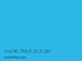 Yxy 40.769,0.21,0.26 Color is a normal blue color and the nearest color is Scooter #2ebfd4. Hex code #2db8e9 and RGB value is rgb(45,184,233). In RGB color space, this color is composed of 18% red, 72% green, 91% blue, In CMYK color space, this color is composed of 81% cyan, 21% magenta, 0% yellow , 9% black , In HSL color space, this color has a hue angle of 196° , 81% saturation and 55% lightness.