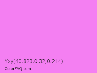 Yxy 40.823,0.32,0.214 Color is a light magenta color and the nearest color is Light Fuchsia Pink #f984ef. Hex code #f47ff2 and RGB value is rgb(244,127,242). In RGB color space, this color is composed of 96% red, 50% green, 95% blue, In CMYK color space, this color is composed of 0% cyan, 48% magenta, 1% yellow , 4% black , In HSL color space, this color has a hue angle of 301° , 84% saturation and 73% lightness.