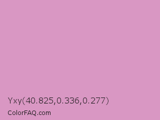 Yxy 40.825,0.336,0.277 Color is a light magenta color and the nearest color is Shocking #e292c0. Hex code #d997c3 and RGB value is rgb(217,151,195). In RGB color space, this color is composed of 85% red, 59% green, 76% blue, In CMYK color space, this color is composed of 0% cyan, 30% magenta, 10% yellow , 15% black , In HSL color space, this color has a hue angle of 320° , 46% saturation and 72% lightness.