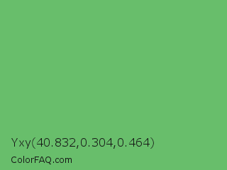Yxy 40.832,0.304,0.464 Color is a normal green color and the nearest color is Fern #63b76c. Hex code #68be6b and RGB value is rgb(104,190,107). In RGB color space, this color is composed of 41% red, 75% green, 42% blue, In CMYK color space, this color is composed of 45% cyan, 0% magenta, 44% yellow , 25% black , In HSL color space, this color has a hue angle of 122° , 40% saturation and 58% lightness.