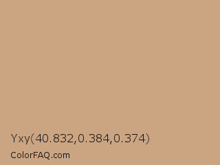 Yxy 40.832,0.384,0.374 Color is a light orange color and the nearest color is Light French Beige #c8ad7f. Hex code #cba481 and RGB value is rgb(203,164,129). In RGB color space, this color is composed of 80% red, 64% green, 51% blue, In CMYK color space, this color is composed of 0% cyan, 19% magenta, 36% yellow , 20% black , In HSL color space, this color has a hue angle of 28° , 42% saturation and 65% lightness.