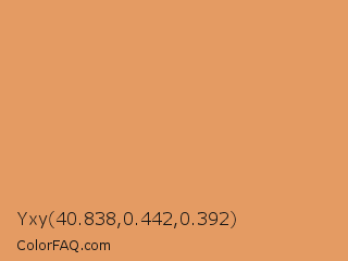 Yxy 40.838,0.442,0.392 Color is a light orange color and the nearest color is Di Serria #db995e. Hex code #e49b63 and RGB value is rgb(228,155,99). In RGB color space, this color is composed of 89% red, 61% green, 39% blue, In CMYK color space, this color is composed of 0% cyan, 32% magenta, 57% yellow , 11% black , In HSL color space, this color has a hue angle of 26° , 70% saturation and 64% lightness.