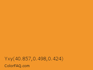 Yxy 40.857,0.498,0.424 Color is a normal orange color and the nearest color is Fire Bush #e89928. Hex code #f2962a and RGB value is rgb(242,150,42). In RGB color space, this color is composed of 95% red, 59% green, 16% blue, In CMYK color space, this color is composed of 0% cyan, 38% magenta, 83% yellow , 5% black , In HSL color space, this color has a hue angle of 32° , 88% saturation and 56% lightness.