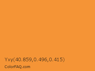 Yxy 40.859,0.496,0.415 Color is a normal orange color and the nearest color is Neon Carrot Crayola #ff9933. Hex code #f59436 and RGB value is rgb(245,148,54). In RGB color space, this color is composed of 96% red, 58% green, 21% blue, In CMYK color space, this color is composed of 0% cyan, 40% magenta, 78% yellow , 4% black , In HSL color space, this color has a hue angle of 30° , 91% saturation and 59% lightness.