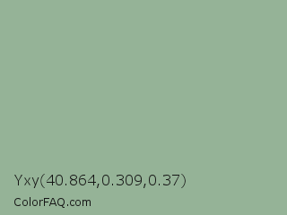 Yxy 40.864,0.309,0.37 Color is a light green color and the nearest color is Dark Sea Green #8fbc8f. Hex code #95b397 and RGB value is rgb(149,179,151). In RGB color space, this color is composed of 58% red, 70% green, 59% blue, In CMYK color space, this color is composed of 17% cyan, 0% magenta, 16% yellow , 30% black , In HSL color space, this color has a hue angle of 124° , 16% saturation and 64% lightness.