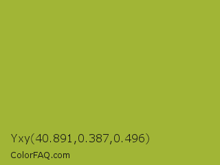 Yxy 40.891,0.387,0.496 Color is a normal yellow color and the nearest color is Android Green #a4c639. Hex code #a1b536 and RGB value is rgb(161,181,54). In RGB color space, this color is composed of 63% red, 71% green, 21% blue, In CMYK color space, this color is composed of 11% cyan, 0% magenta, 70% yellow , 29% black , In HSL color space, this color has a hue angle of 69° , 54% saturation and 46% lightness.