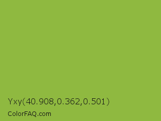 Yxy 40.908,0.362,0.501 Color is a normal green color and the nearest color is Sushi #87ab39. Hex code #8fb940 and RGB value is rgb(143,185,64). In RGB color space, this color is composed of 56% red, 73% green, 25% blue, In CMYK color space, this color is composed of 23% cyan, 0% magenta, 65% yellow , 27% black , In HSL color space, this color has a hue angle of 81° , 49% saturation and 49% lightness.