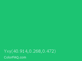 Yxy 40.914,0.268,0.472 Color is a normal green color and the nearest color is Green Crayola #1cac78. Hex code #1cc472 and RGB value is rgb(28,196,114). In RGB color space, this color is composed of 11% red, 77% green, 45% blue, In CMYK color space, this color is composed of 86% cyan, 0% magenta, 42% yellow , 23% black , In HSL color space, this color has a hue angle of 151° , 75% saturation and 44% lightness.