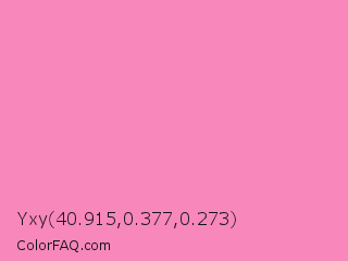Yxy 40.915,0.377,0.273 Color is a light rose color and the nearest color is Persian Pink #f77fbe. Hex code #f887bc and RGB value is rgb(248,135,188). In RGB color space, this color is composed of 97% red, 53% green, 74% blue, In CMYK color space, this color is composed of 0% cyan, 46% magenta, 24% yellow , 3% black , In HSL color space, this color has a hue angle of 332° , 89% saturation and 75% lightness.