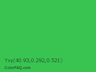 Yxy 40.93,0.292,0.521 Color is a normal green color and the nearest color is Chateau Green #40a860. Hex code #39c452 and RGB value is rgb(57,196,82). In RGB color space, this color is composed of 22% red, 77% green, 32% blue, In CMYK color space, this color is composed of 71% cyan, 0% magenta, 58% yellow , 23% black , In HSL color space, this color has a hue angle of 131° , 55% saturation and 50% lightness.