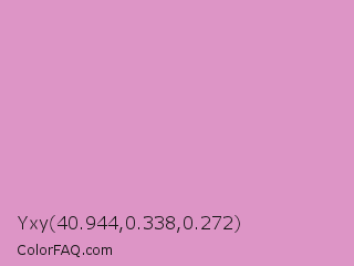 Yxy 40.944,0.338,0.272 Color is a light magenta color and the nearest color is Shocking #e292c0. Hex code #dd95c6 and RGB value is rgb(221,149,198). In RGB color space, this color is composed of 87% red, 58% green, 78% blue, In CMYK color space, this color is composed of 0% cyan, 33% magenta, 10% yellow , 13% black , In HSL color space, this color has a hue angle of 319° , 51% saturation and 73% lightness.