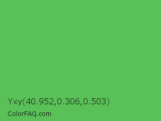 Yxy 40.952,0.306,0.503 Color is a normal green color and the nearest color is Fern #63b76c. Hex code #59c157 and RGB value is rgb(89,193,87). In RGB color space, this color is composed of 35% red, 76% green, 34% blue, In CMYK color space, this color is composed of 54% cyan, 0% magenta, 55% yellow , 24% black , In HSL color space, this color has a hue angle of 119° , 46% saturation and 55% lightness.
