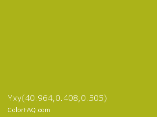 Yxy 40.964,0.408,0.505 Color is a normal yellow color and the nearest color is Acid Green #b0bf1a. Hex code #abb319 and RGB value is rgb(171,179,25). In RGB color space, this color is composed of 67% red, 70% green, 10% blue, In CMYK color space, this color is composed of 4% cyan, 0% magenta, 86% yellow , 30% black , In HSL color space, this color has a hue angle of 63° , 75% saturation and 40% lightness.