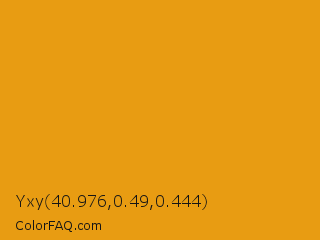 Yxy 40.976,0.49,0.444 Color is a normal orange color and the nearest color is Gamboge #e49b0f. Hex code #e89c12 and RGB value is rgb(232,156,18). In RGB color space, this color is composed of 91% red, 61% green, 7% blue, In CMYK color space, this color is composed of 0% cyan, 33% magenta, 92% yellow , 9% black , In HSL color space, this color has a hue angle of 39° , 86% saturation and 49% lightness.