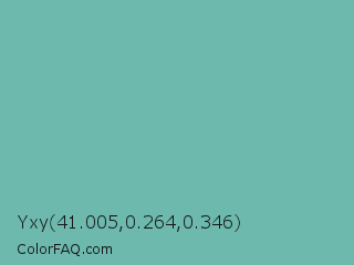Yxy 41.005,0.264,0.346 Color is a normal cyan color and the nearest color is Tradewind #5fb3ac. Hex code #6db9ae and RGB value is rgb(109,185,174). In RGB color space, this color is composed of 43% red, 73% green, 68% blue, In CMYK color space, this color is composed of 41% cyan, 0% magenta, 6% yellow , 27% black , In HSL color space, this color has a hue angle of 171° , 35% saturation and 58% lightness.