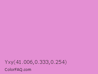 Yxy 41.006,0.333,0.254 Color is a light magenta color and the nearest color is Light Orchid #e29cd2. Hex code #e48fd3 and RGB value is rgb(228,143,211). In RGB color space, this color is composed of 89% red, 56% green, 83% blue, In CMYK color space, this color is composed of 0% cyan, 37% magenta, 7% yellow , 11% black , In HSL color space, this color has a hue angle of 312° , 61% saturation and 73% lightness.