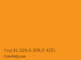 Yxy 41.029,0.509,0.425 Color is a normal orange color and the nearest color is Tree Poppy #fc9c1d. Hex code #f7941b and RGB value is rgb(247,148,27). In RGB color space, this color is composed of 97% red, 58% green, 11% blue, In CMYK color space, this color is composed of 0% cyan, 40% magenta, 89% yellow , 3% black , In HSL color space, this color has a hue angle of 33° , 93% saturation and 54% lightness.