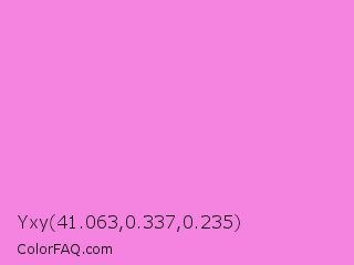 Yxy 41.063,0.337,0.235 Color is a light magenta color and the nearest color is Pale Magenta #f984e5. Hex code #f484df and RGB value is rgb(244,132,223). In RGB color space, this color is composed of 96% red, 52% green, 87% blue, In CMYK color space, this color is composed of 0% cyan, 46% magenta, 9% yellow , 4% black , In HSL color space, this color has a hue angle of 311° , 84% saturation and 74% lightness.