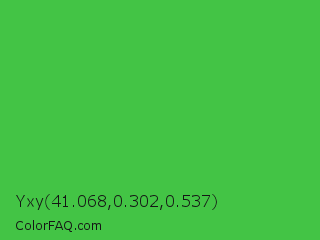 Yxy 41.068,0.302,0.537 Color is a normal green color and the nearest color is Lime Green #32cd32. Hex code #43c445 and RGB value is rgb(67,196,69). In RGB color space, this color is composed of 26% red, 77% green, 27% blue, In CMYK color space, this color is composed of 66% cyan, 0% magenta, 65% yellow , 23% black , In HSL color space, this color has a hue angle of 121° , 52% saturation and 52% lightness.