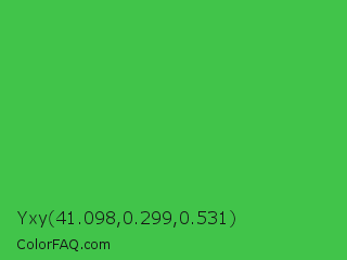 Yxy 41.098,0.299,0.531 Color is a normal green color and the nearest color is Lime Green #32cd32. Hex code #41c44a and RGB value is rgb(65,196,74). In RGB color space, this color is composed of 25% red, 77% green, 29% blue, In CMYK color space, this color is composed of 67% cyan, 0% magenta, 62% yellow , 23% black , In HSL color space, this color has a hue angle of 124° , 53% saturation and 51% lightness.