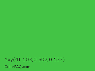 Yxy 41.103,0.302,0.537 Color is a normal green color and the nearest color is Lime Green #32cd32. Hex code #43c445 and RGB value is rgb(67,196,69). In RGB color space, this color is composed of 26% red, 77% green, 27% blue, In CMYK color space, this color is composed of 66% cyan, 0% magenta, 65% yellow , 23% black , In HSL color space, this color has a hue angle of 121° , 52% saturation and 52% lightness.