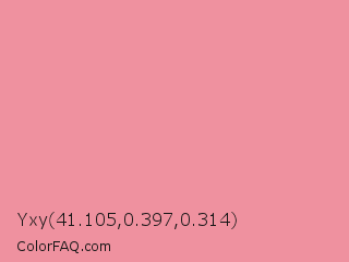 Yxy 41.105,0.397,0.314 Color is a light red color and the nearest color is Sea Pink #ed989e. Hex code #ef919f and RGB value is rgb(239,145,159). In RGB color space, this color is composed of 94% red, 57% green, 62% blue, In CMYK color space, this color is composed of 0% cyan, 39% magenta, 33% yellow , 6% black , In HSL color space, this color has a hue angle of 351° , 75% saturation and 75% lightness.