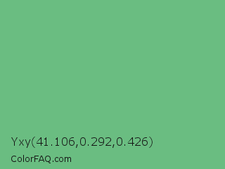 Yxy 41.106,0.292,0.426 Color is a normal green color and the nearest color is Iguana Green #71bc78. Hex code #6abd81 and RGB value is rgb(106,189,129). In RGB color space, this color is composed of 42% red, 74% green, 51% blue, In CMYK color space, this color is composed of 44% cyan, 0% magenta, 32% yellow , 26% black , In HSL color space, this color has a hue angle of 137° , 39% saturation and 58% lightness.