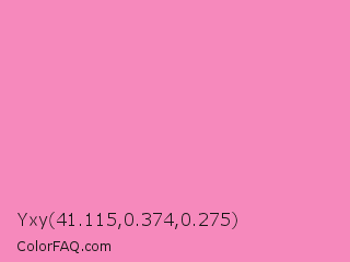Yxy 41.115,0.374,0.275 Color is a light rose color and the nearest color is Persian Pink #f77fbe. Hex code #f689bc and RGB value is rgb(246,137,188). In RGB color space, this color is composed of 96% red, 54% green, 74% blue, In CMYK color space, this color is composed of 0% cyan, 44% magenta, 24% yellow , 4% black , In HSL color space, this color has a hue angle of 332° , 86% saturation and 75% lightness.